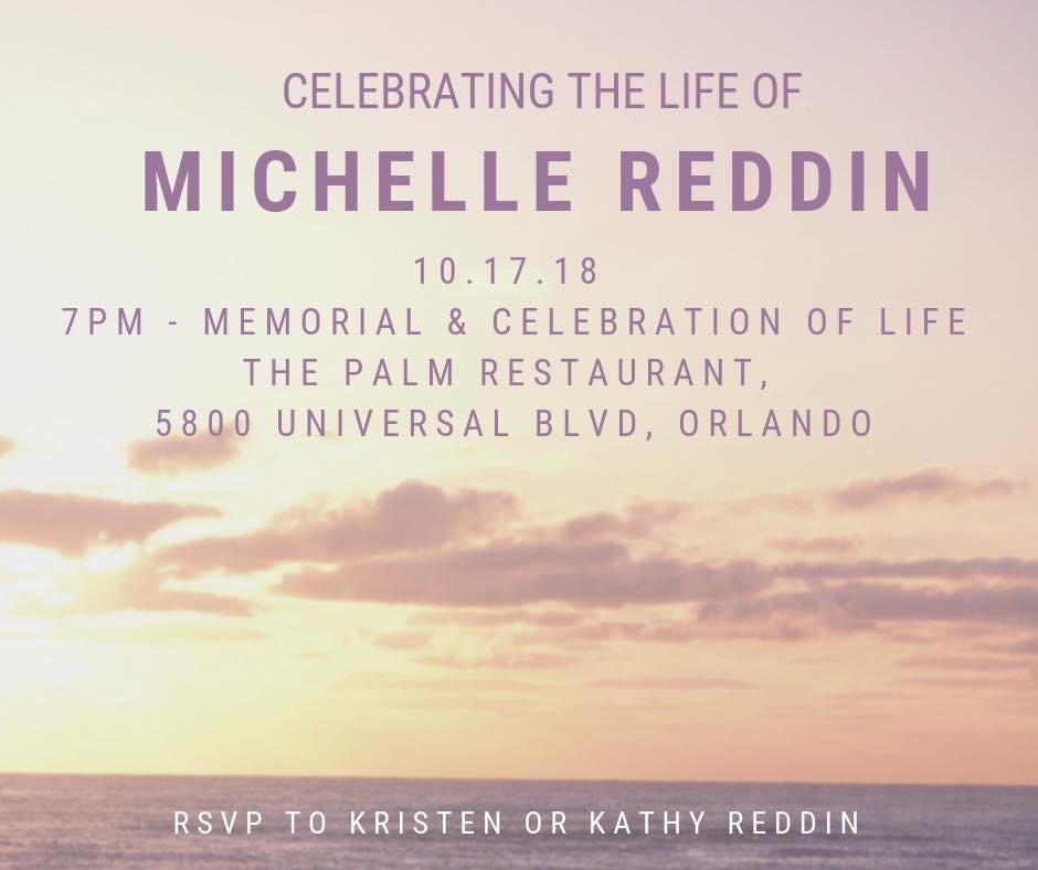 To Michelle’s Friends and colleagues – it is with great sadness that I share the news of Michelle Reddin’s passing on Sunday, September 23. Michelle was a wonderful, smart, funny friend and colleague to many. She battled illness of late and took a sudden turn for the worse a few weeks ago. Her Mom, Kathy, and sister, Kristen have planned a celebration of life so that we can gather to share memories of Michelle’s tremendous, albeit way too short, life. Please join us if you are able – details are below. Please do share with others who may care to know. Also, to help the family defray end-of-life expenses, a Go Fund Me campaign has been established (see link below). If you are considering sending flowers or another thoughtful remembrance, please give some thought to a contribution to this fund. I look forward to seeing you in a few weeks. Tracy