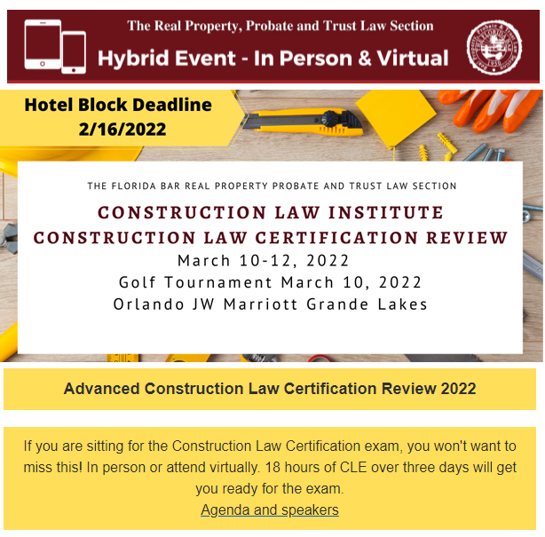 [RPPTL-constructionlaw] REMINDER: REGISTER FOR THE CONSTRUCTION LAW INSTITUTE / CONSTRUCTION LAW CERTIFICATION REVIEW COURSE ON MARCH 10-12, 2022