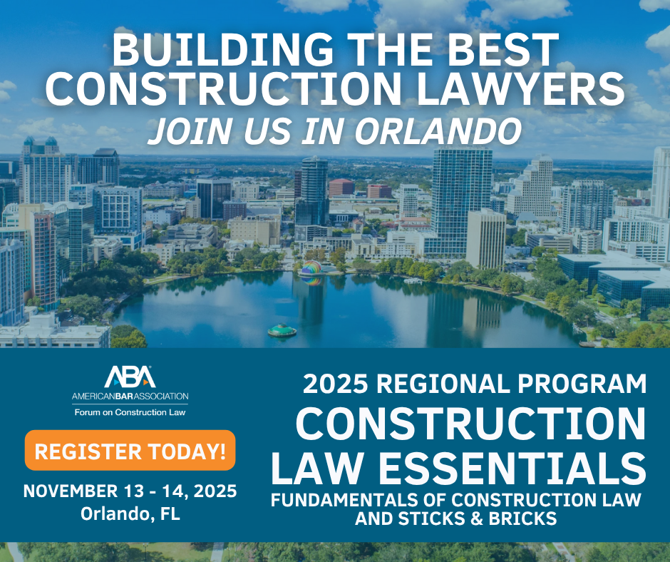 As mentioned during yesterday's CLC meeting, the ABA Construction Law Forum's Regional Meeting will take place on November 13-14, 2025, in Orlando. The program will take place at the offices of GrayRobinson, P.A., 301 E. Pine Street, Suite 1400, Orlando, FL 32801.