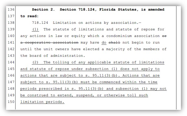As many of you may recall, our Committee recently took a position on potential revisions to close gaps in the statutes of limitations and repose on actions arising from construction projects in Section 95.11(3)(b). At the time, one of our committee’s concerns was that there was a potential for a developer to retain control of a condominium association until such time as the statute of repose expires. Section 718.124 was later amended to add the words “and statute of repose,” which mitigated those concerns:
