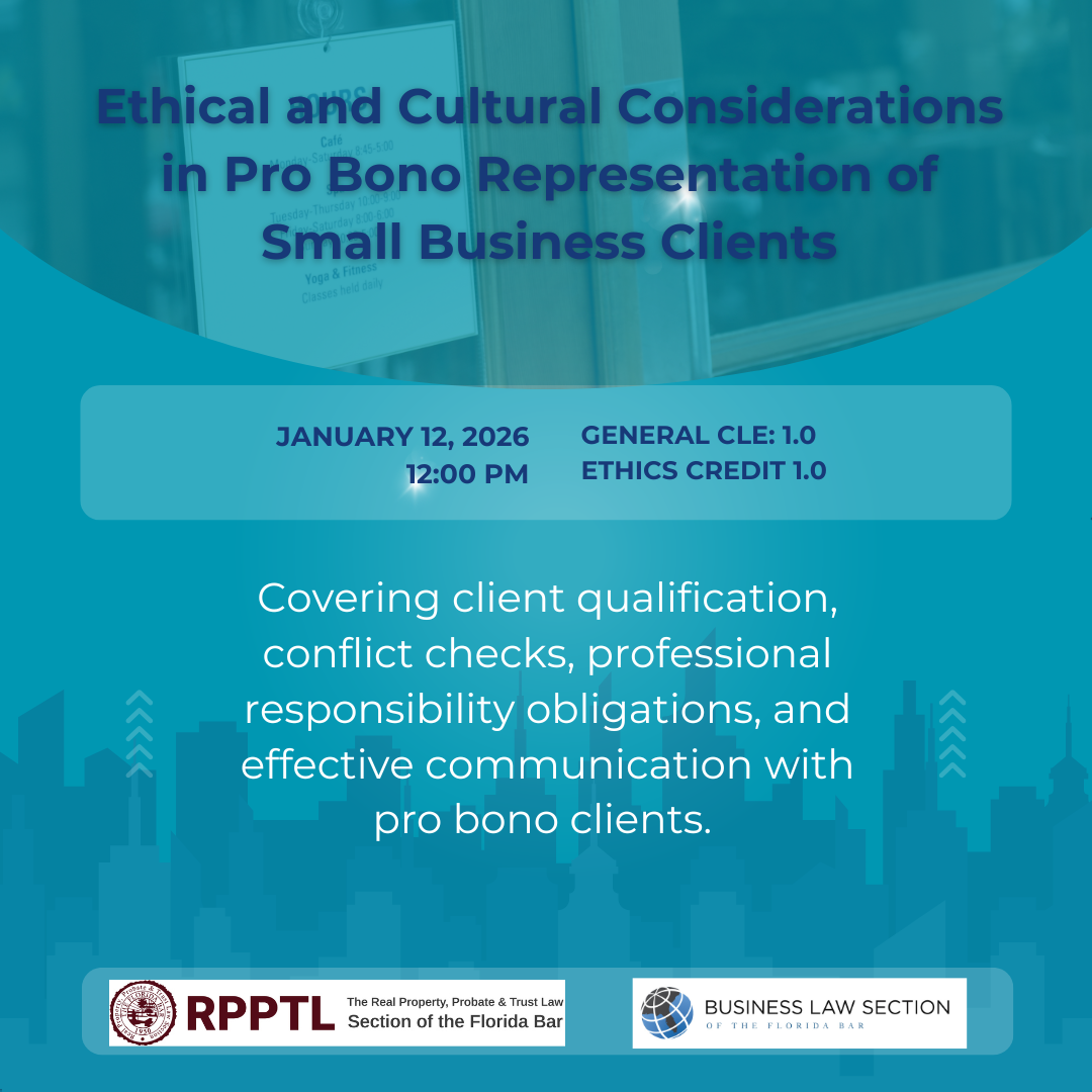 The CLE is entitled: On Ethical and Cultural Considerations in Pro Bono Representation of Small Business Clients. This informative program will feature representatives from Community Development Legal Services • Florida Community Development Legal Project<https://link.edgepilot.com/s/bf7aacc1/V0HIpMMwAEi4PONDNypVBA?u=https://flcommunitydevelopment.org/>. This program will be a joint presentation hosted by the Business Law Section Pro Bono Committee, the RPPTL At-Large Member Pro Bono Committee, and the CLC Pro Bono Subcommittee. This program will take place immediately after the CLC’s January business meeting from 11:30am-12pm; please note that in order to attend this free CLE, you must click this link to register: https://link.edgepilot.com/s/d8c25e40/0lHwq_HYaU63MpPxsx4m2w?u=https://member.floridabar.org/s/lt-event?id=a1RWQ00000LtXSH2A3%23/Overview -- YOU WILL NEED TO BE LOGGED INTO THE FLORIDA BAR WEBSITE IN ORDER TO REGISTER, so I suggest doing that first.