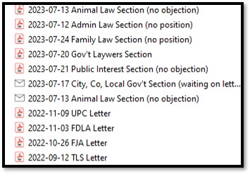 * Below is the list of letters of support/no objection obtained, and I am waiting on City, Co, Local Gov’t Section’s and RPPTL’s letter of support. Also, there are a handful of other sections with whom I am meeting in the coming months.
