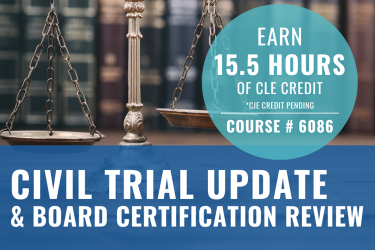 The Trial Lawyers Section annually hosts the Civil Trial Update & Board Certification Review<http://FB.informz.net/z/cjUucD9taT0xMDg5MzU1MiZwPTEmdT0xMDk1OTU5NjY3JmxpPTk5Mjc1MjIz/index.html>. The two-day seminar is intended to assist those who have applied to take the certification exam in Civil Trial or Business Litigation in preparing for the exam or those thinking about taking the exam in the future<http://FB.informz.net/z/cjUucD9taT0xMDg5MzU1MiZwPTEmdT0xMDk1OTU5NjY3JmxpPTk5Mjc1MjI0/index.html>. It is also a refresher course for anyone practicing Civil or Business Litigation. Each year the course covers relevant topics such as Trial Skills, including Opening & Closing, Voir Dire, and Preserving the Record for Appeal, Electronic Discovery, and recent updates relevant to everyday practice for Civil and Business litigators.
