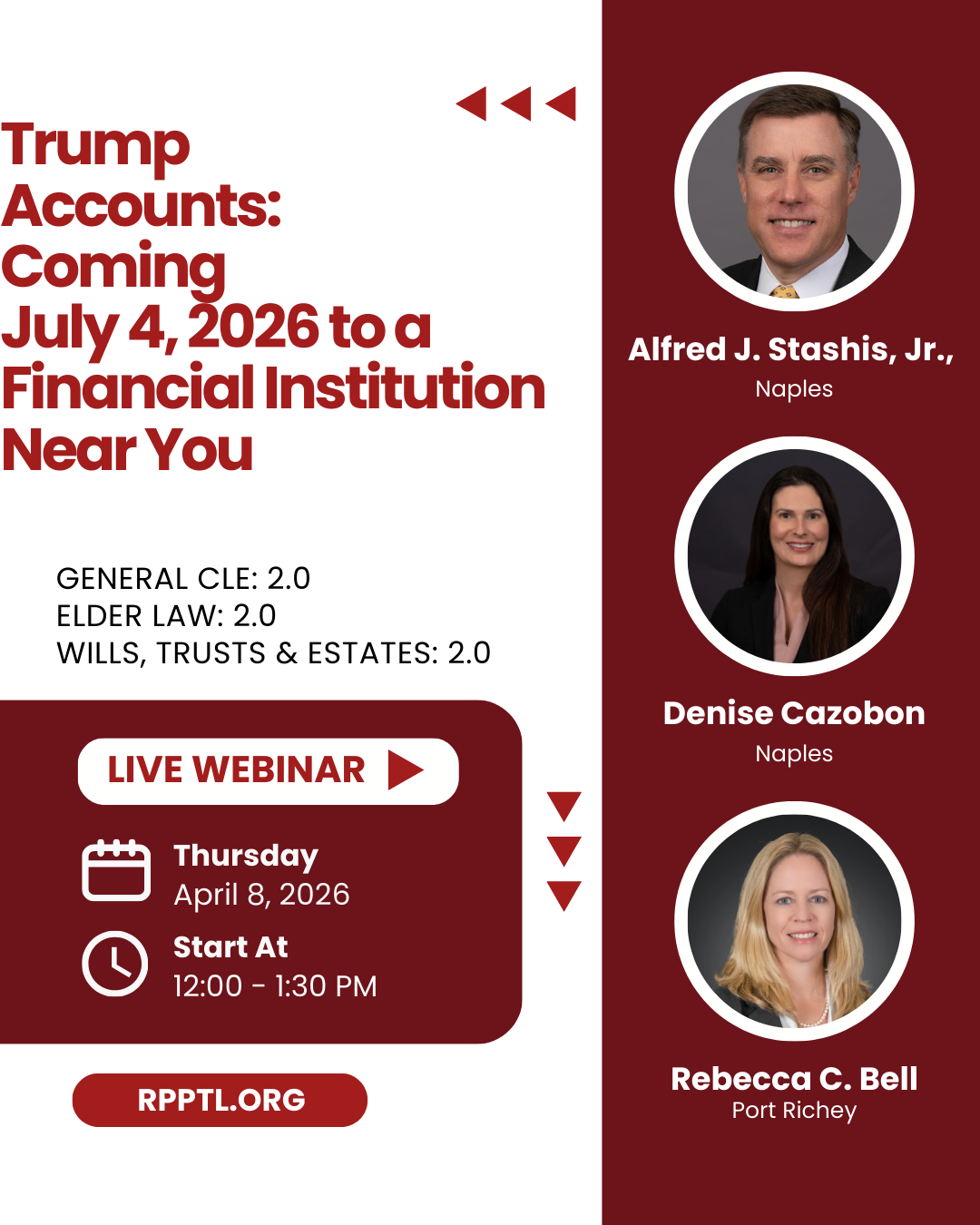 Full RPPTL CLE calendar can be found here<https://links.us1.defend.egress.com/Warning?crId=69d55ecdfb6ef7f7fb52e6ec&Domain=trenam.com&Threat=eNpzrShJLcpLzAEADmkDRA%3D%3D&Lang=en&Base64Url=eNoN0FlygjAAANDb9A8MGkA7w3SCexE0SgD56SSRVVaJgpy-HuD9vFSIpvueTDrBbzydUyZzLj86Ta4iMRGVnHfNT2wAoChrcoAjgT3GDlgc29p8tnHdL_z8qfS0K8NLXGlpGNAmjwvPfSWb5LIpRPawB2GZmoQBnGXc06WhGrKIBNcq_QW5WO5mehAQBcUsotBpQ2-obZxHPmSuo-NwH3neqRzBfgfQUzQJFeEyR1dLe-9rDM69pHMzUHmgVtt56VSDPSh344sbR4m6mjc9C4kgq5ypnJE2KYo2fuicZUIZTw4d85e7Wne1XzPTHW5k0xsfmhqqbZer4KWrWzUN32jLEFKswxV9WhwyPCGemio7QEin4L76kzL32KU-Nox_bsxvBg%3D%3D&@OriginalLink=stcdch8ab.cc.rs6.net>.